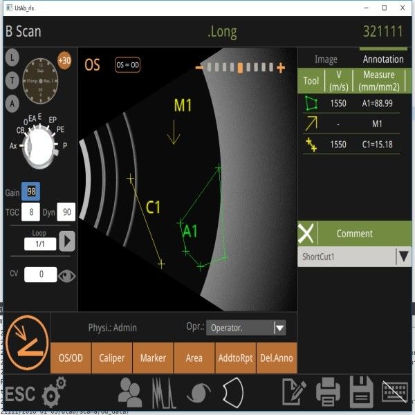 스캔 비는 분명히 그리고 직접적으로 안구의 프로파일 이미지를 보여줍니다. 안구 안에서 해부학적 형태와 병소를 스캐닝할 때, 의사들은 백내장과 유리체 질병, 눈 외상, 망막 박리 또는 맥락막, 흑점 질병과 눈 내 종양, 기타 등등에 관한 검사를 위해 정확하게 진단할 수 있습니다